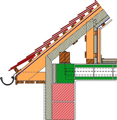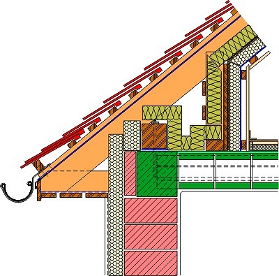 Ácsszerkezetű magastető és homlokzati fal csatlakozása. Expandált PS hab hőszigetelés.