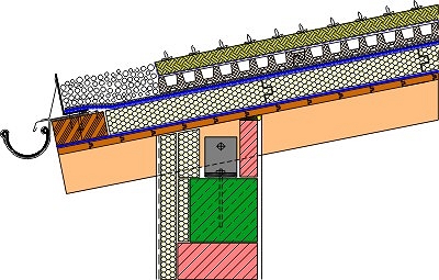 Tetőfelújítás. Egyenes rétegrendű nem járható melegtető. Eresz részlete. Expandált PS hab utólagos hőszigetelés.