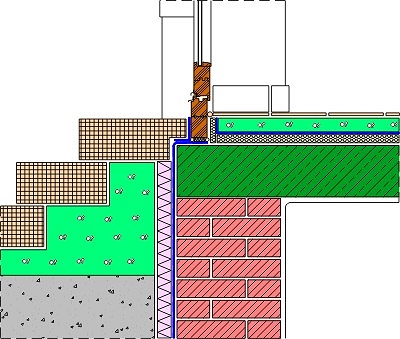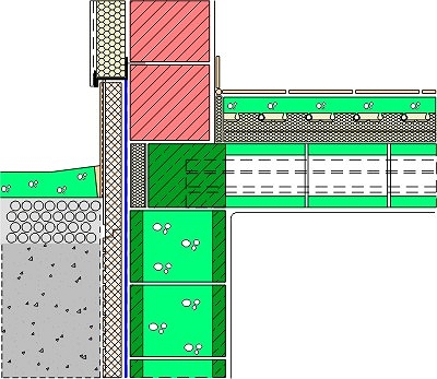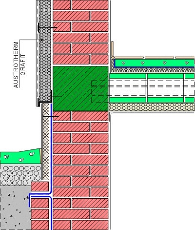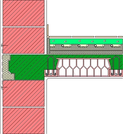 Közbenső födém és külső fal csatlakozása. Padlófűtés. Expandált PS hab hőszigetelés.