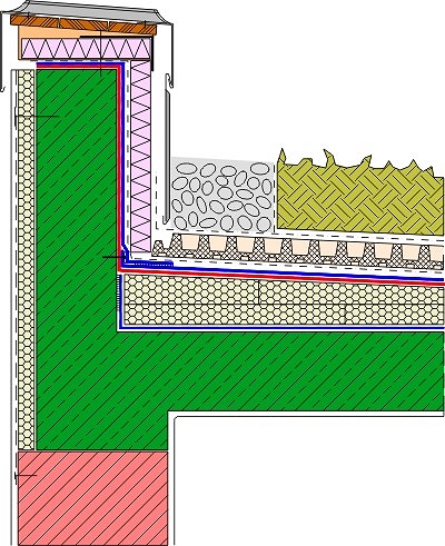 Egyenes rétegrendű zöldtető. Attika részlete. Expandált PS hab és OÁZIS drén hőszigetelés.