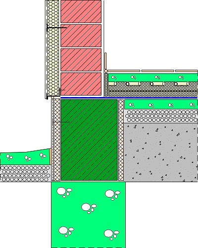 Lábazat kialakítása alápincézett épületnél. Bejárati lépcső (terasz) részlete. Extrudált PS hab hőszigetelés